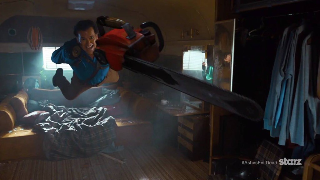 El caso es que ASH vs EVIL DEAD, pone de manifiesto la vigencia de la eterna sociedad entre Sam Raimi y Bruce Campbell, haciendo uso de todo recurso humorístico como el slapstick y comedia física que atraviesa por el cuerpo de Campbell y su oficio actoral. Y bien vale enfatizar el recurso del Slapstick, tan asociado a la pequeña pantalla desde seriales como “Los tres chiflados” o “Abott & Costello”.