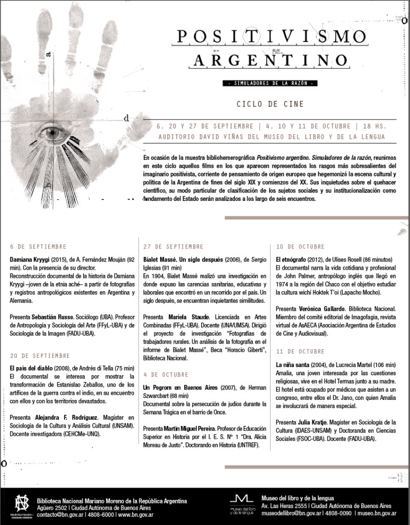 En ocasión de la muestra bibliohemerográfica Positivismo argentino, Simuladores de la razón, reunimos en este ciclo aquellos films en los que aparecen representados los rasgos más sobresalientes del imaginario positivista, corriente de pensamiento de origen europeo que hegemonizó la escena cultural y política de la Argentina de fines del siglo XIX y comienzos del XX. Sus inquietudes sobre el quehacer científico, su modo particular de clasificación de los sujetos sociales y su institucionalización como fundamento del Estado serán analizados a los largo de seis encuentros.