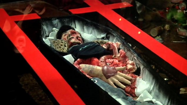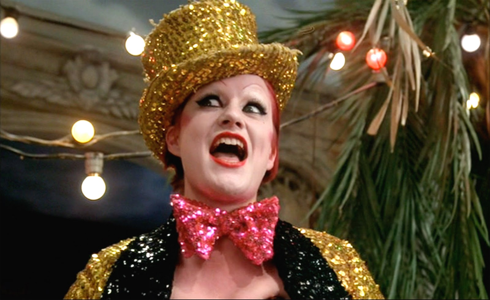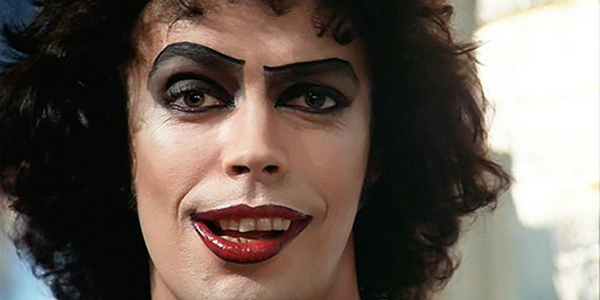 Con un gorrito de fiesta y una mueca perversita, el Dr. Frank N Furter agasaja a sus invitados mientras les revela que todo el tiempo habían estado comiendo sobre el cadáver de Eddie (a quien anteriormente había asesinado con un hacha).