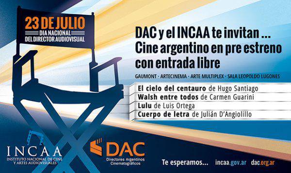 El día jueves 23 de julio, en ocasión de la celebración del Día del Director Audiovisual, Directores Cinematográficos Argentinos (DAC) y el INCAA exhibirán El cielo del centauro, de Hugo Santiago; Lulú, de Luis Ortega (foto); y los documentales Walsh entre todos, de Carmen Guarini; y Cuerpo de letra, de Julián D’Angiolillo.