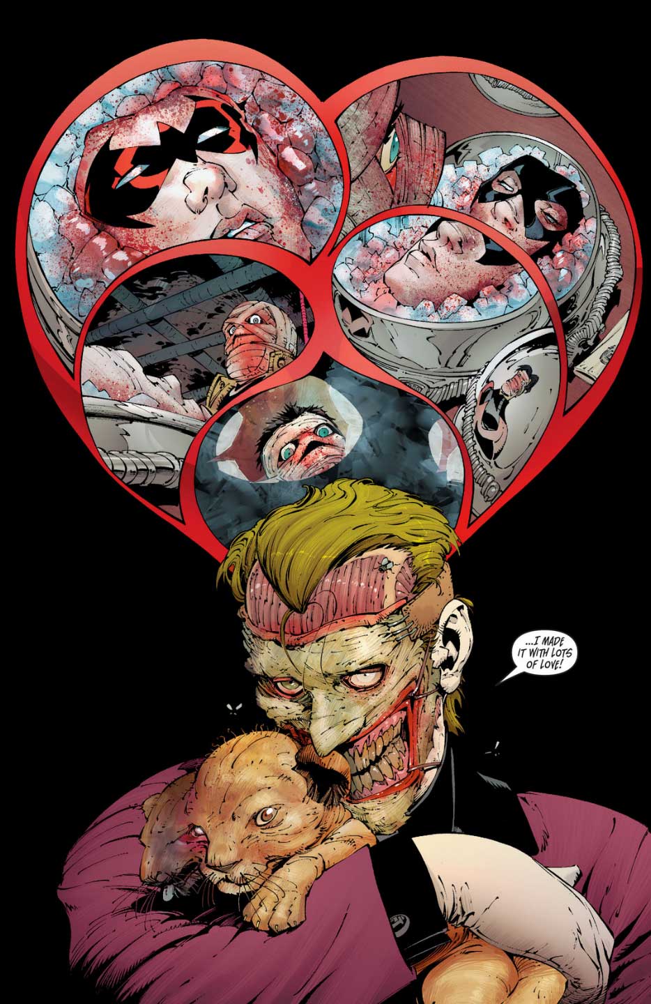 Durante estos 75 años de existencia, el Joker ha representado todo lo que Batman no es, y probablemente nunca se acerque a ser. Ha dictado a diestra y siniestra el destino del caballero de la noche y sus ayudantes en numerosas oportunidades de las maneras más sádicas posibles. Si aquellos que “saben” afirman que peor que lastimar a un hombre es meterte con sus seres queridos, el Joker ha hecho de esto su lei motiv. En dos oportunidades, tocó muy de cerca al comisionado Jim Gordon: en el arco argumental auto conclusivo de La Broma Asesina dejó lisiada a Barbara, su hija y décadas más tarde, en Tierra de Nadie (2000), a Sarah, su esposa. El año ’88 fue el más trágico para Batman en cuanto a desapariciones, para Una Muerte en la Familia el Joker mató a palazos al segundo Robin, Jason Todd. En Injusticia: Dioses Entre Nosotros (2012), el Arlequín del Odio pareció aburrirse de molestar a Batman y decidió meterse con Superman: mediante gas delirante del Espantapájaros, logra que mate a Lois Lane. Si todo esto parece poco, el reboot de los Nuevos 52 de DC trajo a un Joker mucho más sádico y perverso que nunca. En Muerte de la Familia (Batman #17) decide secuestrar a Batman y sus aliados (Nightwing, Robin, Capucha Roja, Batichica, y el Robin Rojo), sentarlos en una mesa, y que la cena principal sean platos ¡con sus propios rostros!