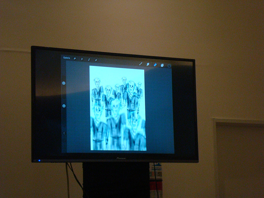 Luego en el escenario secundario pudimos asistir a la charla de Jorge Copó sobre storyboard, y nos fascinó ver en vivo como en pocos minutos, ipad mediante, este artista creaba un dibujo base, y luego lo multiplicada, situaba donde quería, y editaba tamaños, colores. Fue increíble!