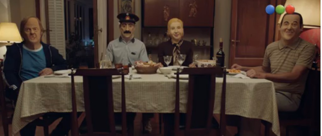 La hija menor es la más sexuada, sugiere y provoca inocentemente en casi todas sus escenas. En cambio la mayor parece tener un despertar espiritual que en la película no se muestra así. Es una lectura interesante de parte de la serie, porque contrapone dos lecturas de vida en una familia turbia, como el cielo y el infierno que mira desde adentro, esto sobre todo se hace notorio en la excelente escena del baile al ritmo de “La grasa de las capitales” al final del segundo capítulo, en la cual todos los personajes terminan con caretas de figuras públicas. Una especie de síntoma de la época, una consecuencia, mostrando a los Puccio como un residuo que dejó la dictadura, mezclado con “viveza criolla”.